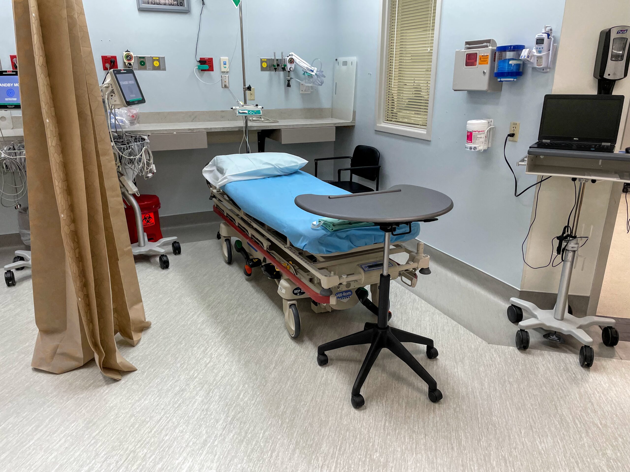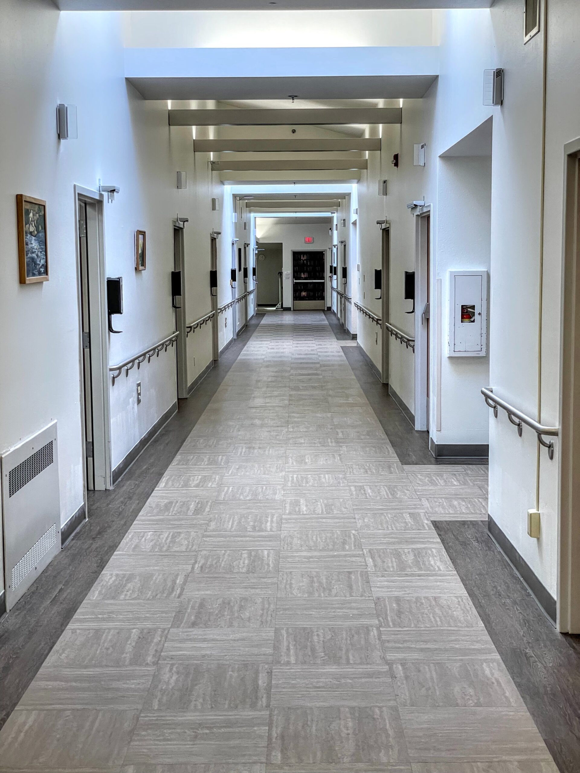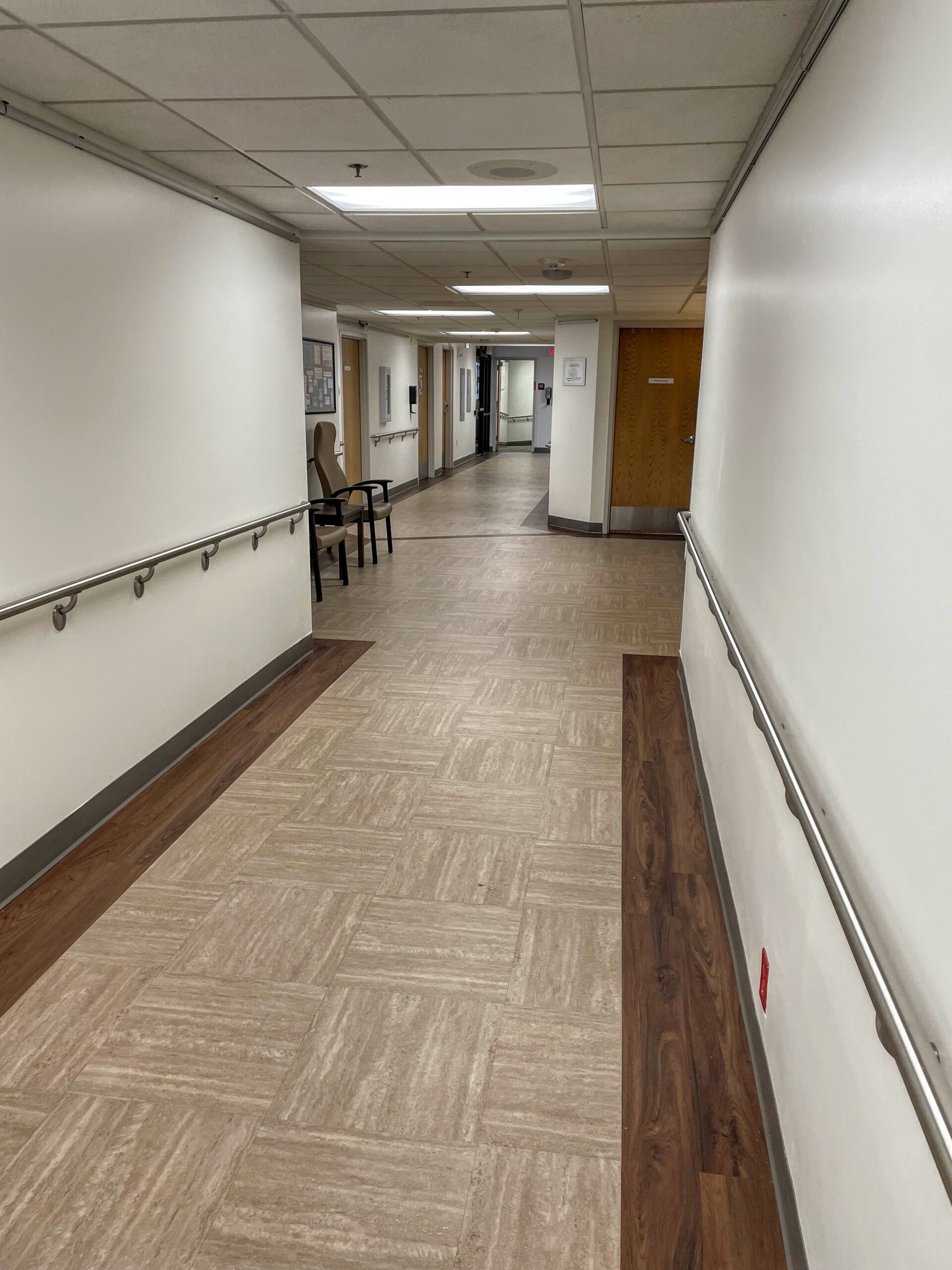 The remodel was paid for with COVID grant money given specifically to have the flooring redone. Over the many years of the hospital’s existence the floors had been re-done a number of times. Further, buildings which had been separate now came together with slabs of varying heights increasing the challenge of this install.