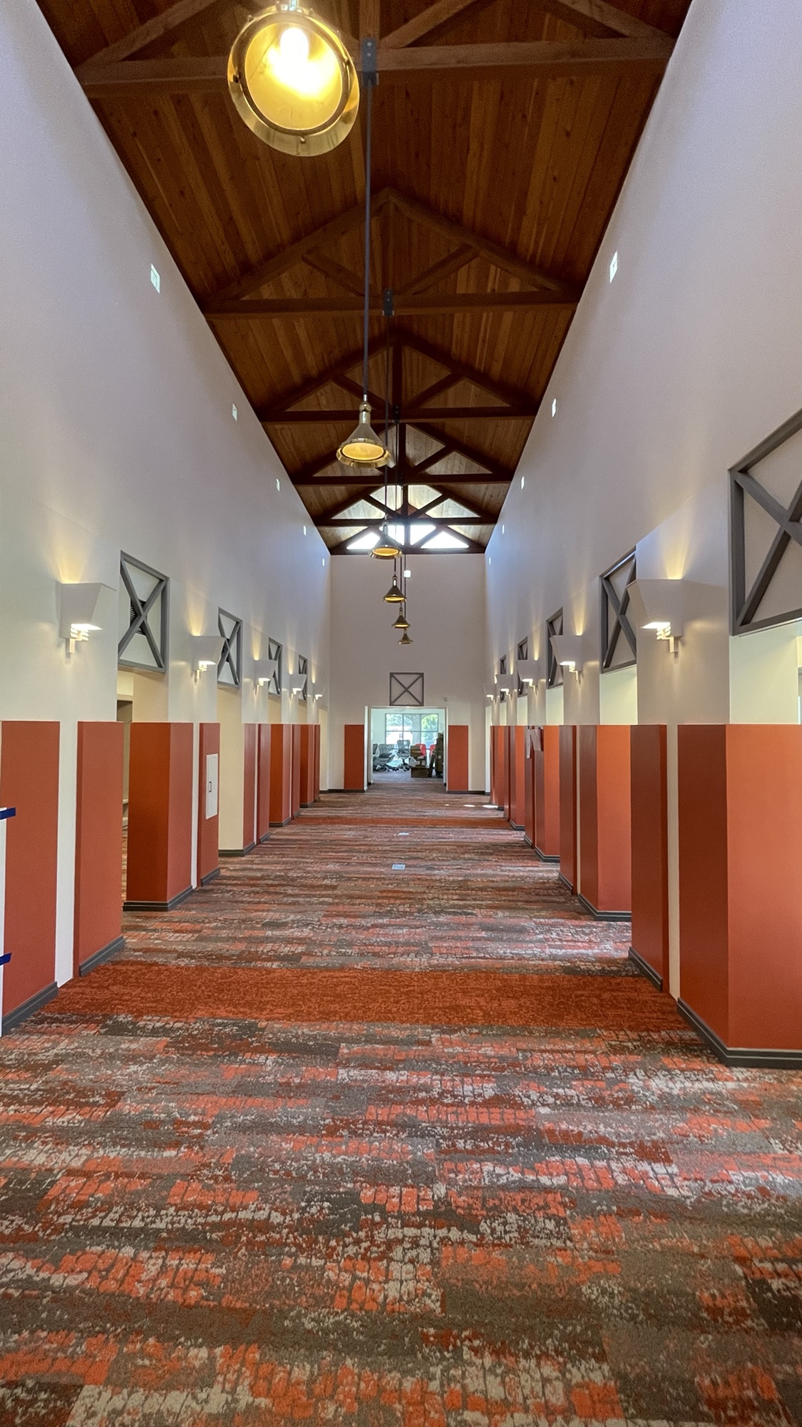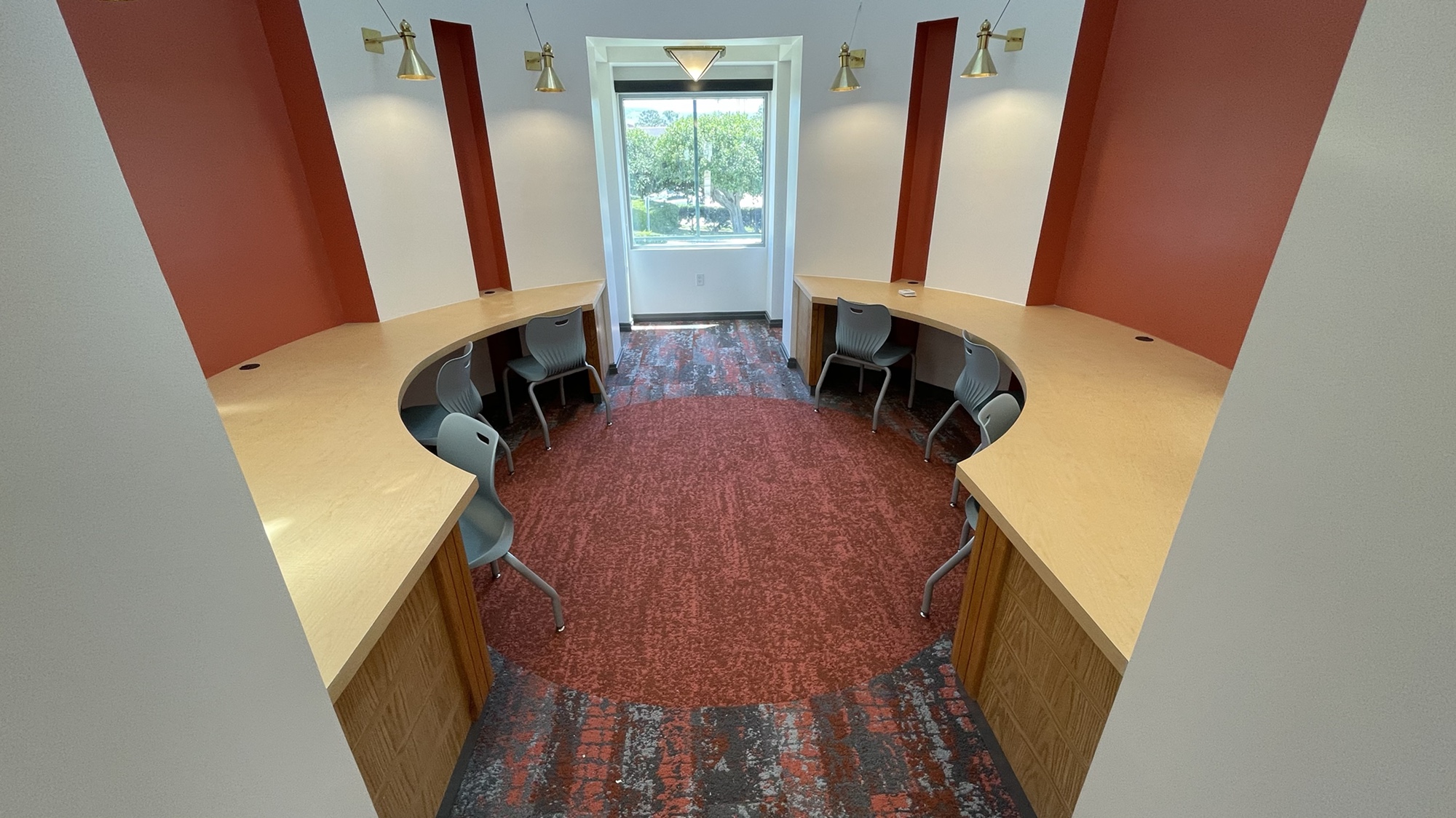 We had the pleasure of working closely with the lead interior designer on this project to assist with product recommendations in the early planning stages. Once they landed on Shaw, we worked closely with both Shaw and the designer to layout and install a few different products that all came together to help highlight the path of travel walkways in between library rooms. This design also included mirroring the unique lighting fixtures above to provide fun accent pops on the flooring beneath them to create an even more cohesive design. Coral might have not been the first color we would have chosen, but once installed, it came together perfectly with the rest of the library’s furnishings and we are big fans!