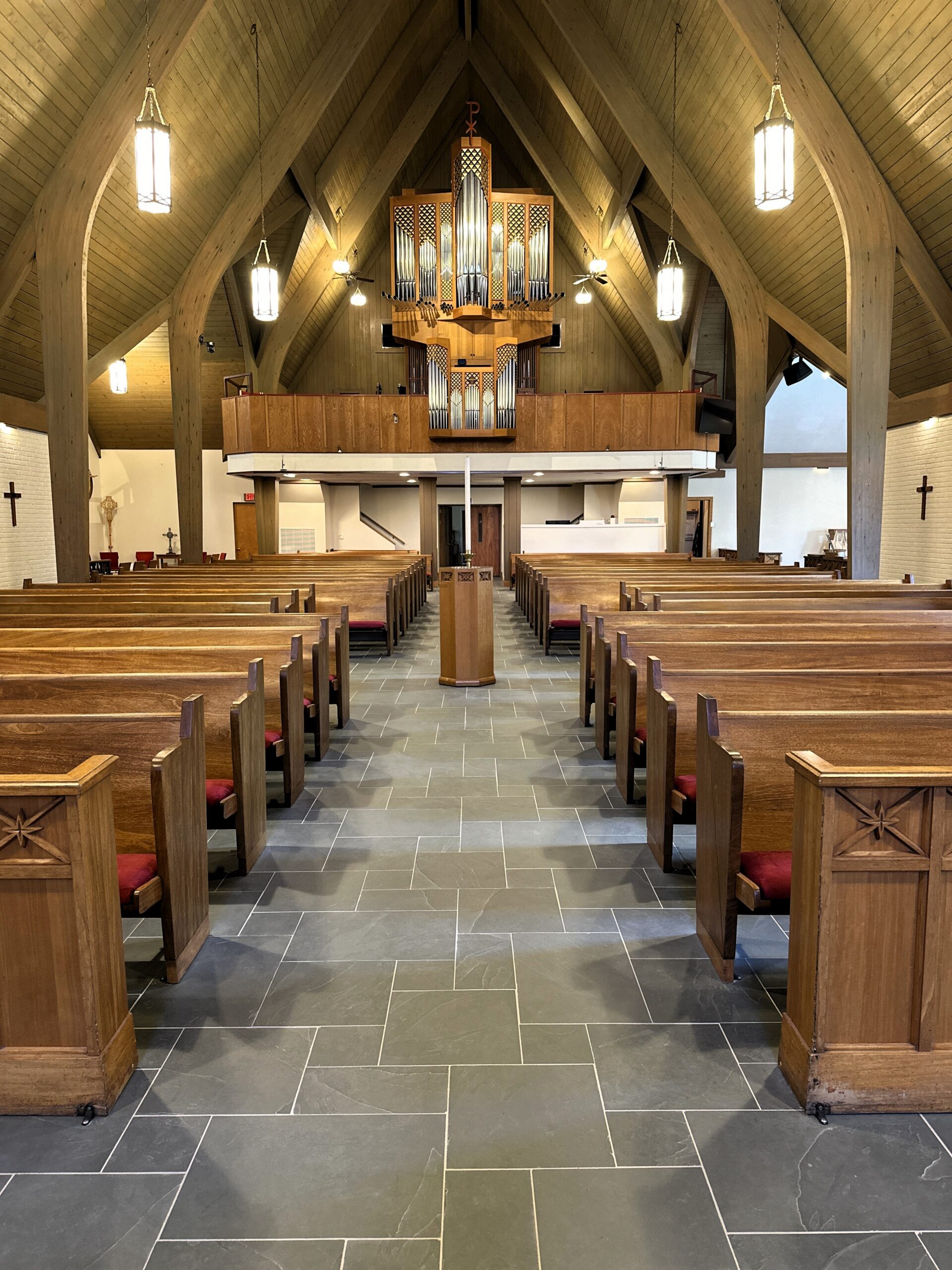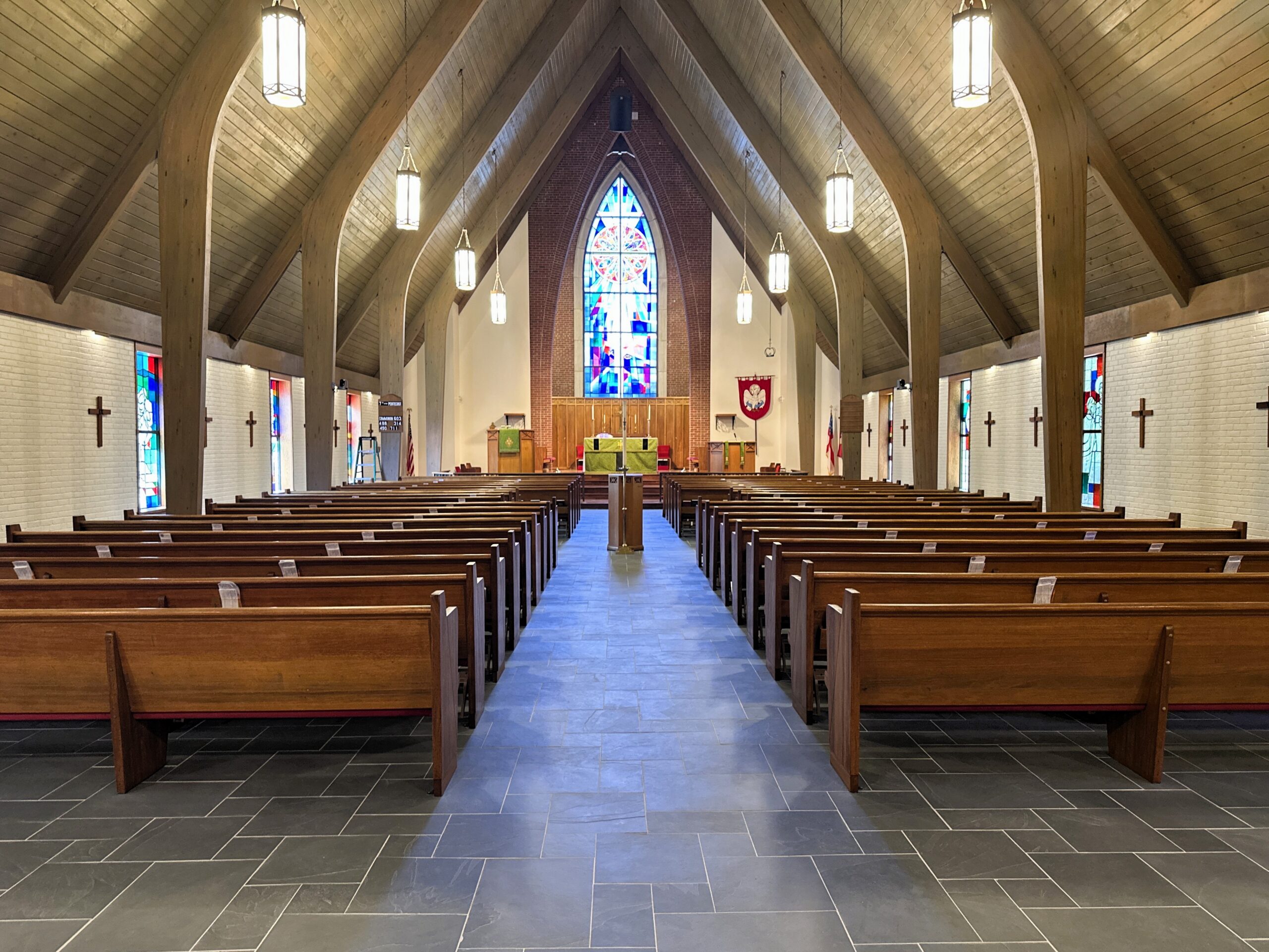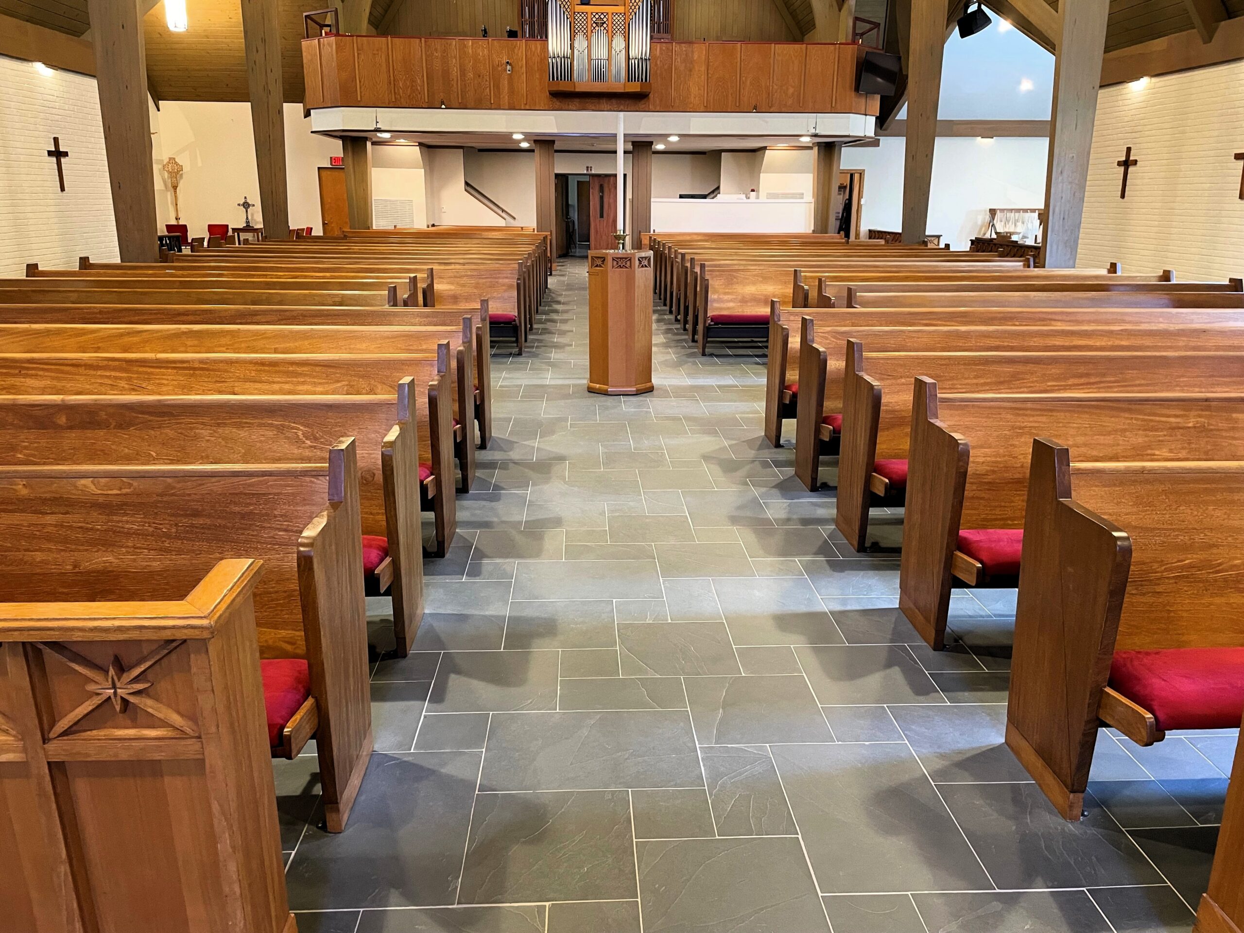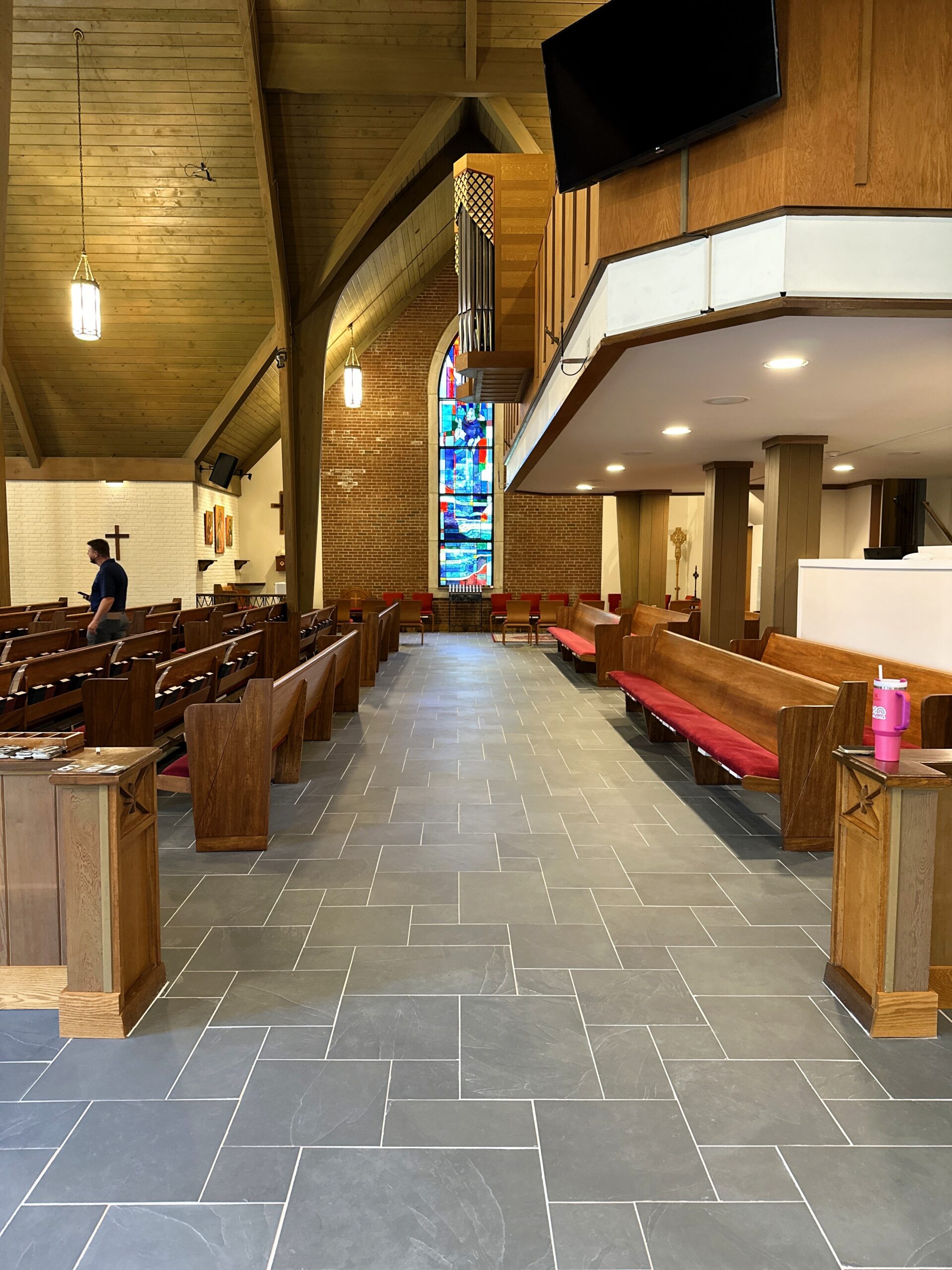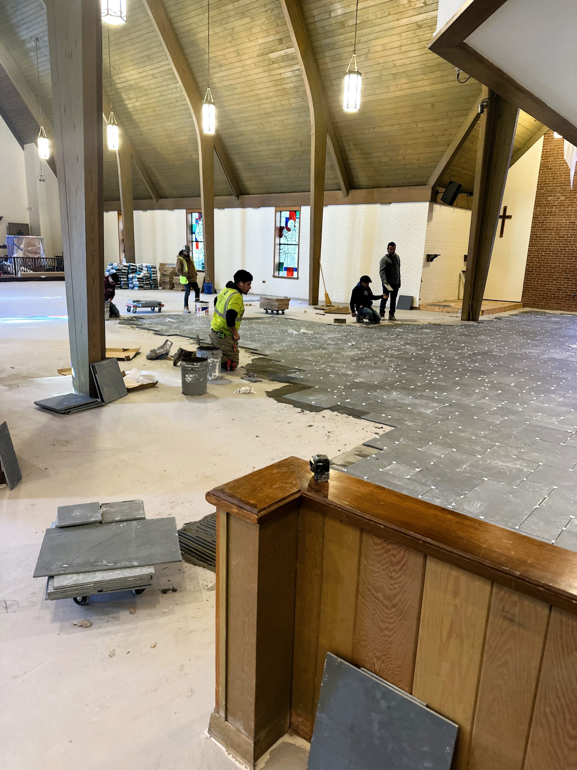 In addition to material and installation coordination, Garmon and Company’s project management team provided added value by coordinating and assisting with pew and furniture removal. This was especially critical due to the presence of fragile woodwork and architectural elements throughout the space, as well as the delicate new tile. Our team carefully sequenced protection, removal, installation, and reinstallation activities to minimize risk to existing finishes and ensure a smooth, respectful construction process within an active worship environment.