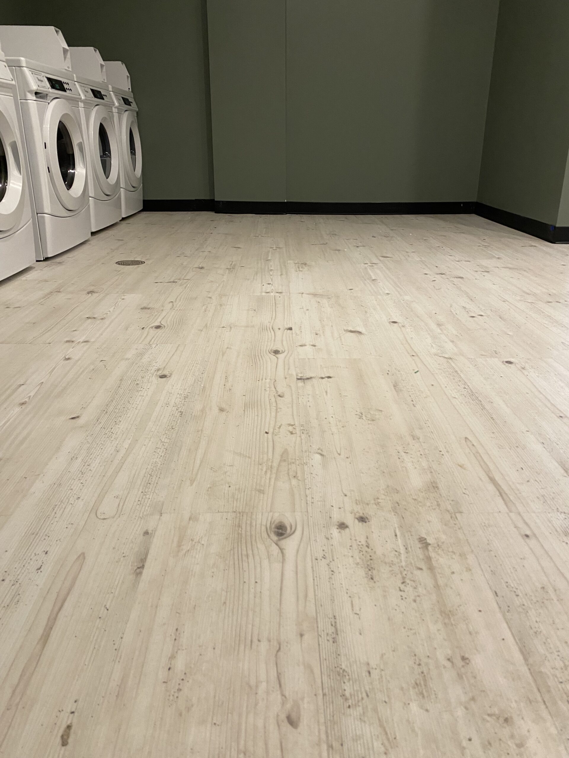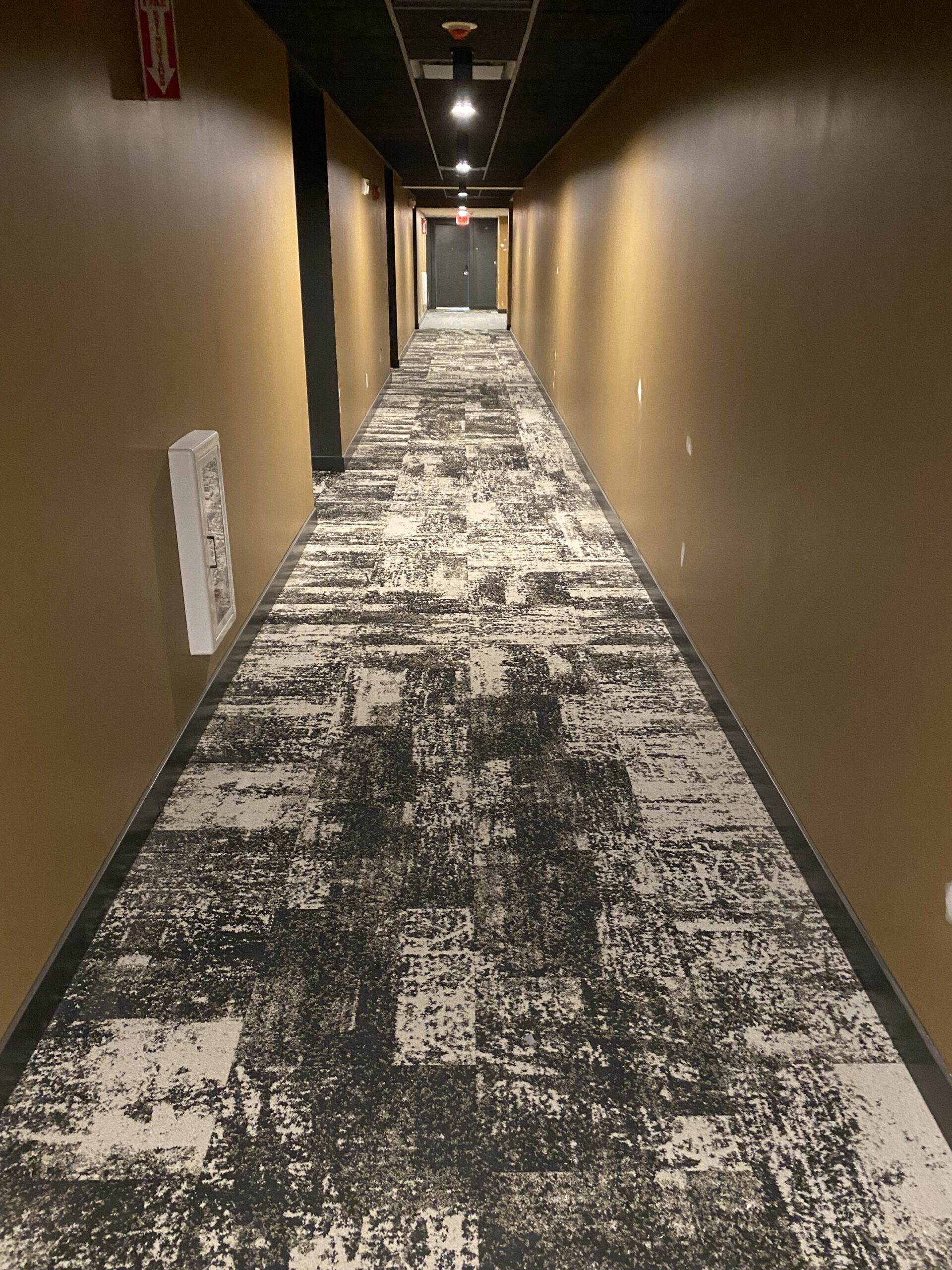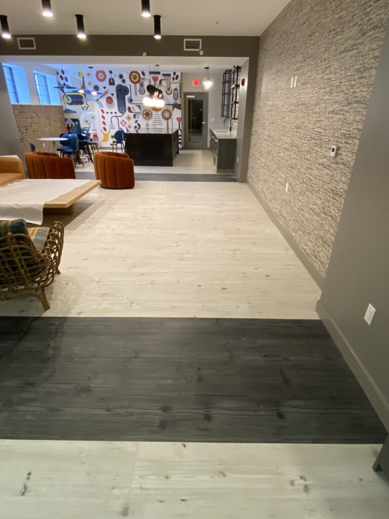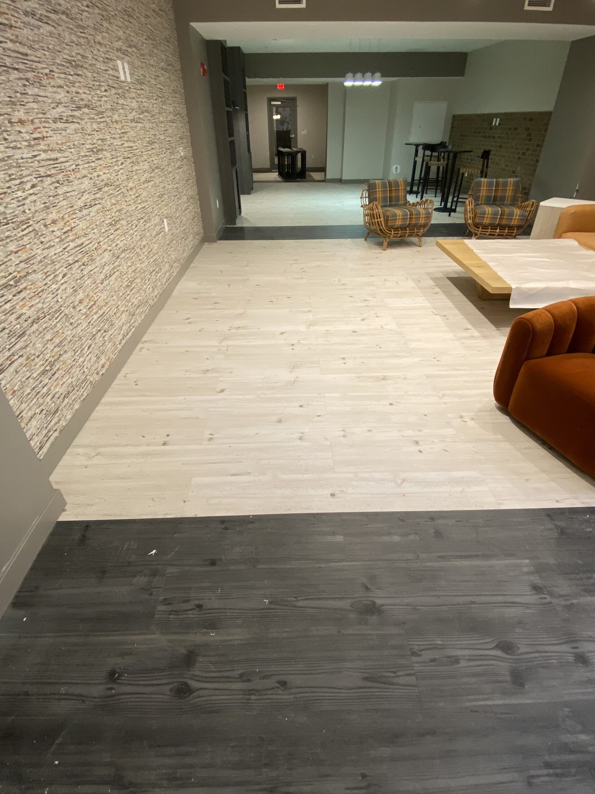 In late 2023, our team embarked on a transformative project to convert a historic 1927 newspaper print facility and office building into modern, functional apartments. This ambitious renovation required us to address the unique challenges posed by the building’s nearly century-old structure, including uneven, damaged, and rough subfloors. To meet these demands while preserving the building’s historic character, we developed a flooring solution combining Mohawk LVT, Milliken carpet tile, and Roppe stair treads and wall base. This innovative approach not only overcame the technical challenges but also enhanced the building’s aesthetic and functional appeal, making it a standout example of adaptive reuse.