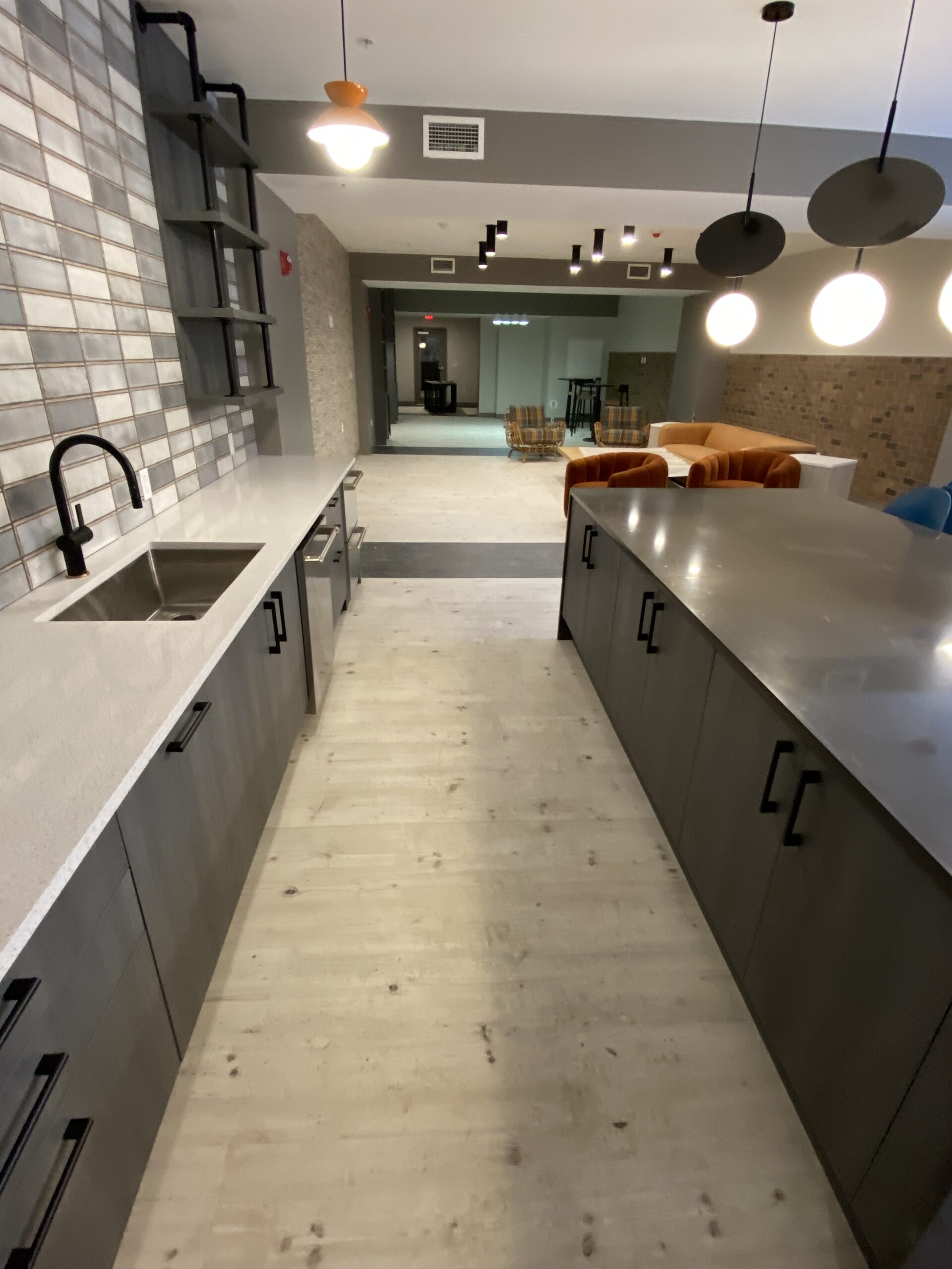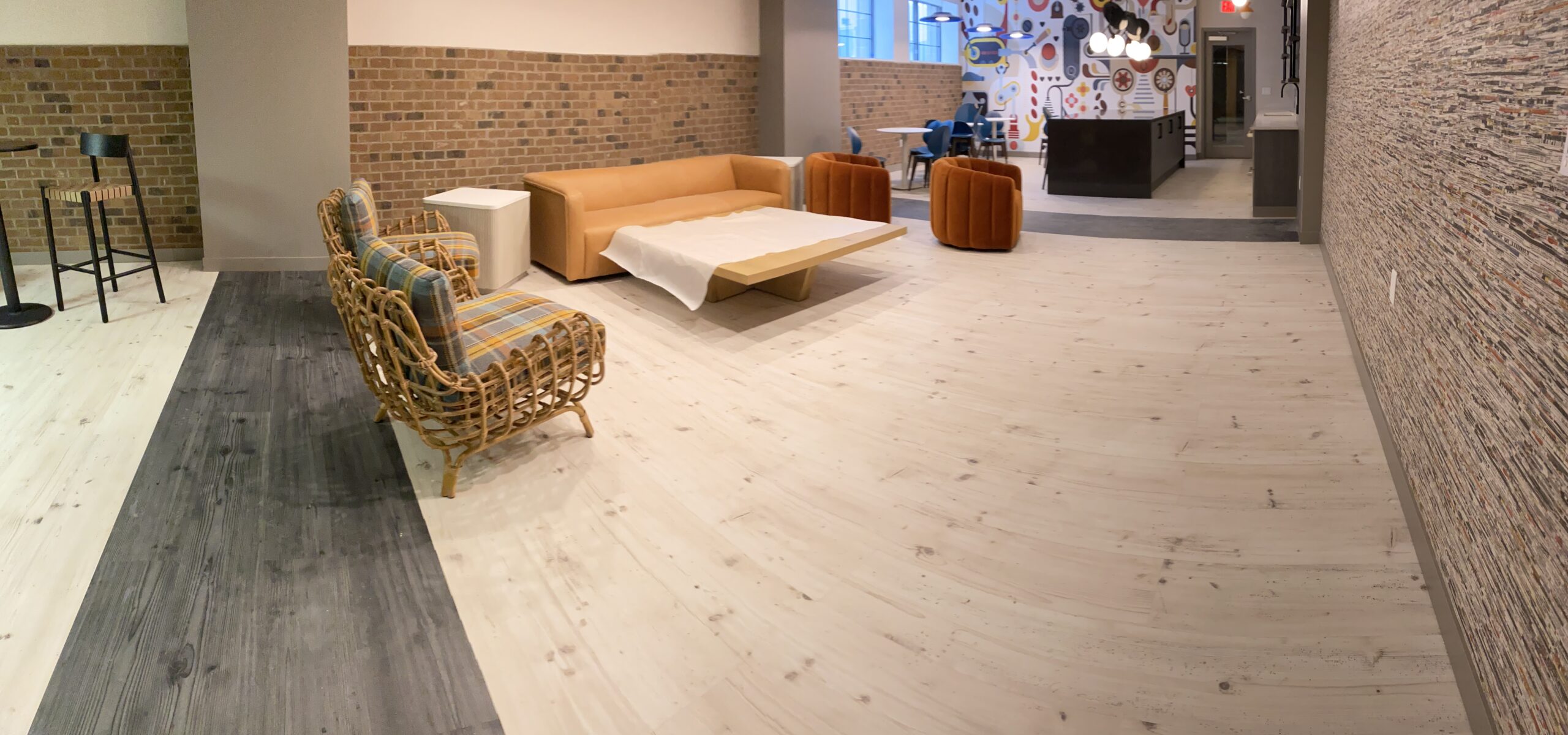 The original building, once bustling with the energy of a newspaper print facility, featured a variety of subfloor conditions that reflected its industrial past. The Mohawk LVT was an ideal choice for the majority of the apartment spaces due to its durability and ability to conform to uneven surfaces. Its wide range of designs allowed us to replicate the look of hardwood and stone, ensuring the flooring complemented the building’s historic charm while providing the modern performance required for residential living.