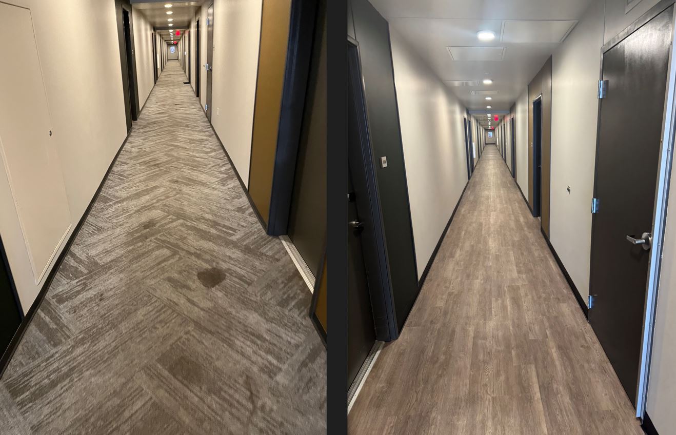 Our scope included the removal and disposal of existing carpet and wall base before we came back with Schonox floor preparation, Mohawk vinyl plank, and Tarkett/Johnsonite’s vinyl cove base. Our crews were given one hour per floor to disassemble each top-mounted threshold, remove the existing carpet tile and preset/reassemble the thresholds to receive new Mohawk luxury vinyl plank at all 186 unit entryways.
