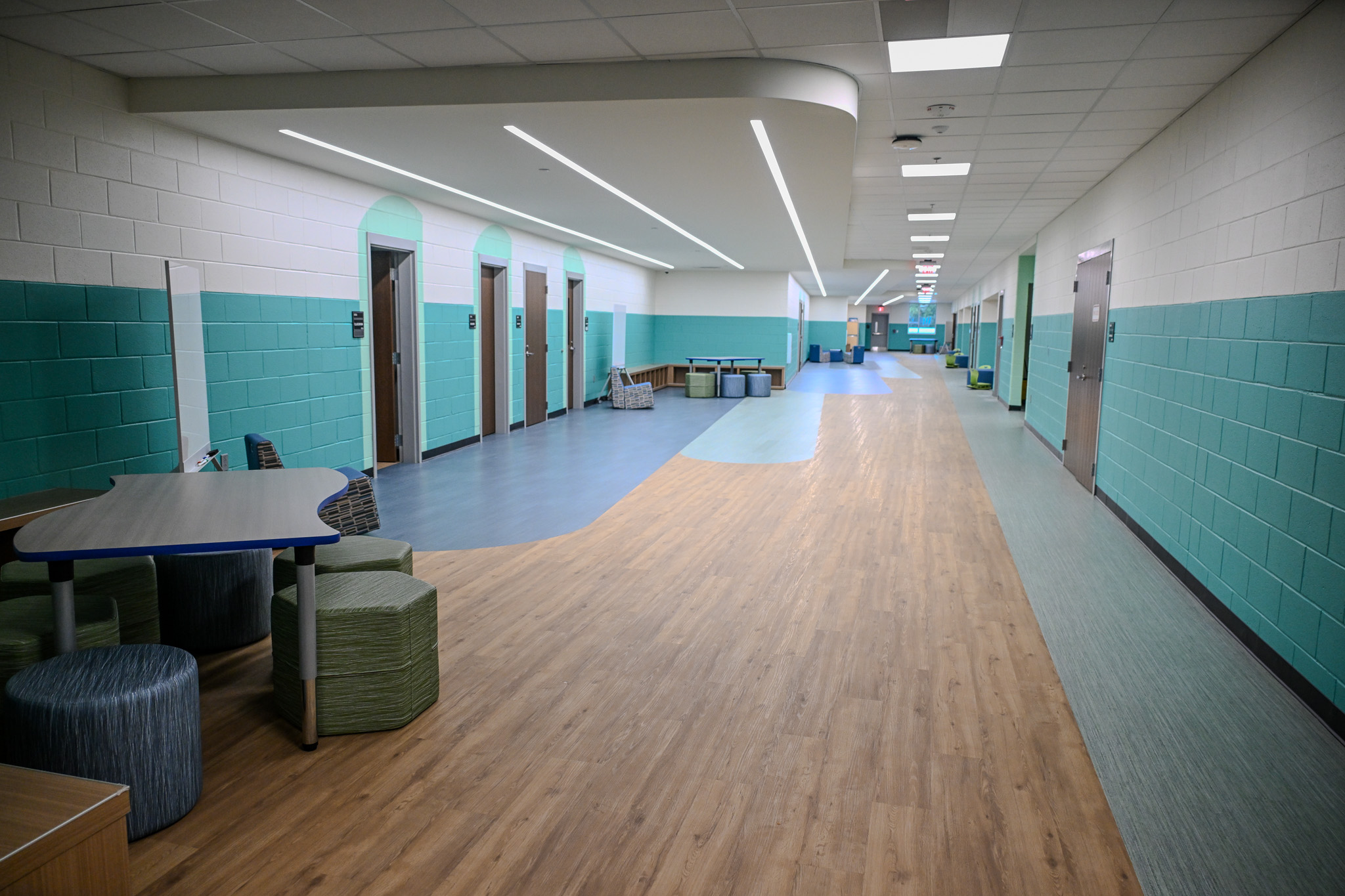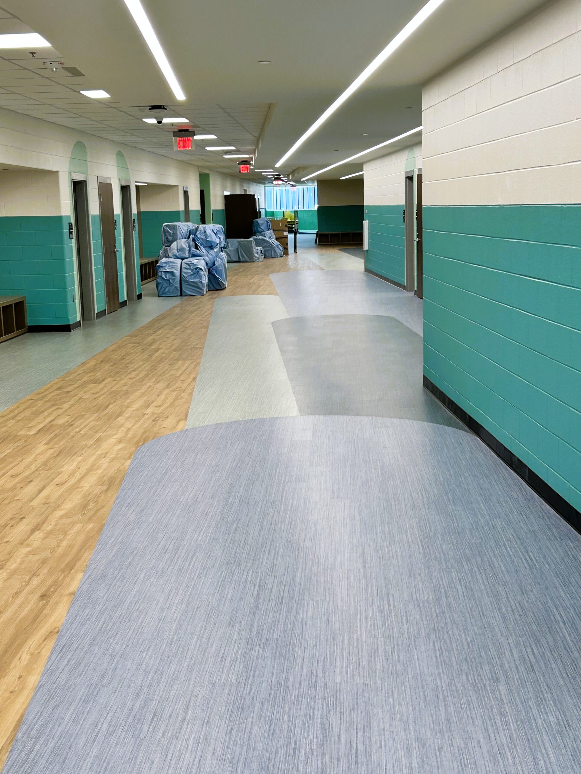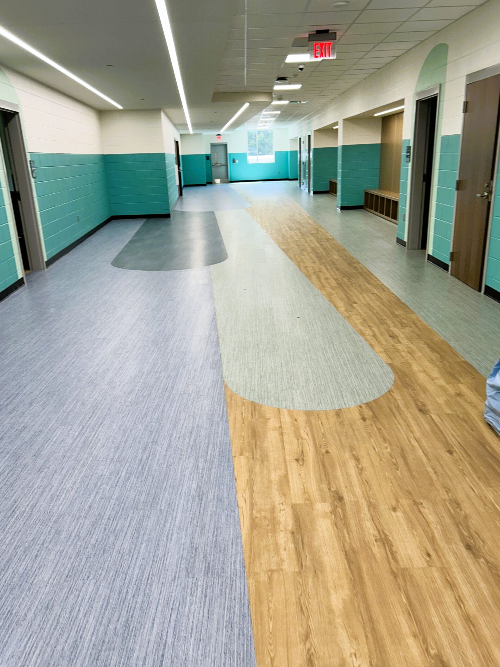 Over 50,000 square feet of Patcraft LVT was installed throughout classrooms and corridors in custom layouts featuring curved pathways, rounded terminations, and integrated color fields. These organic floor shapes required advanced radius scribing, precise pattern control, and consistent alignment across long runs and multiple transitions to maintain visual continuity and performance in high-traffic areas.