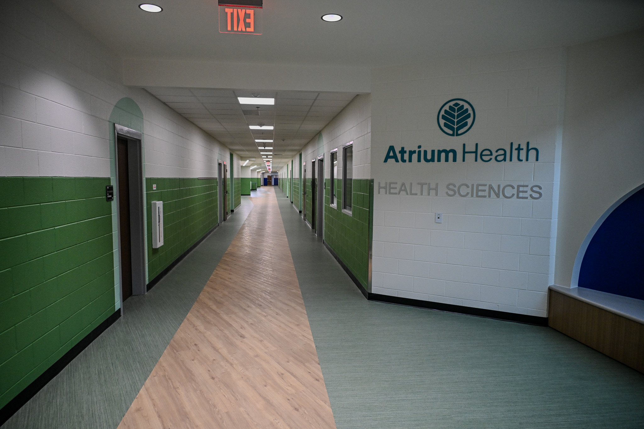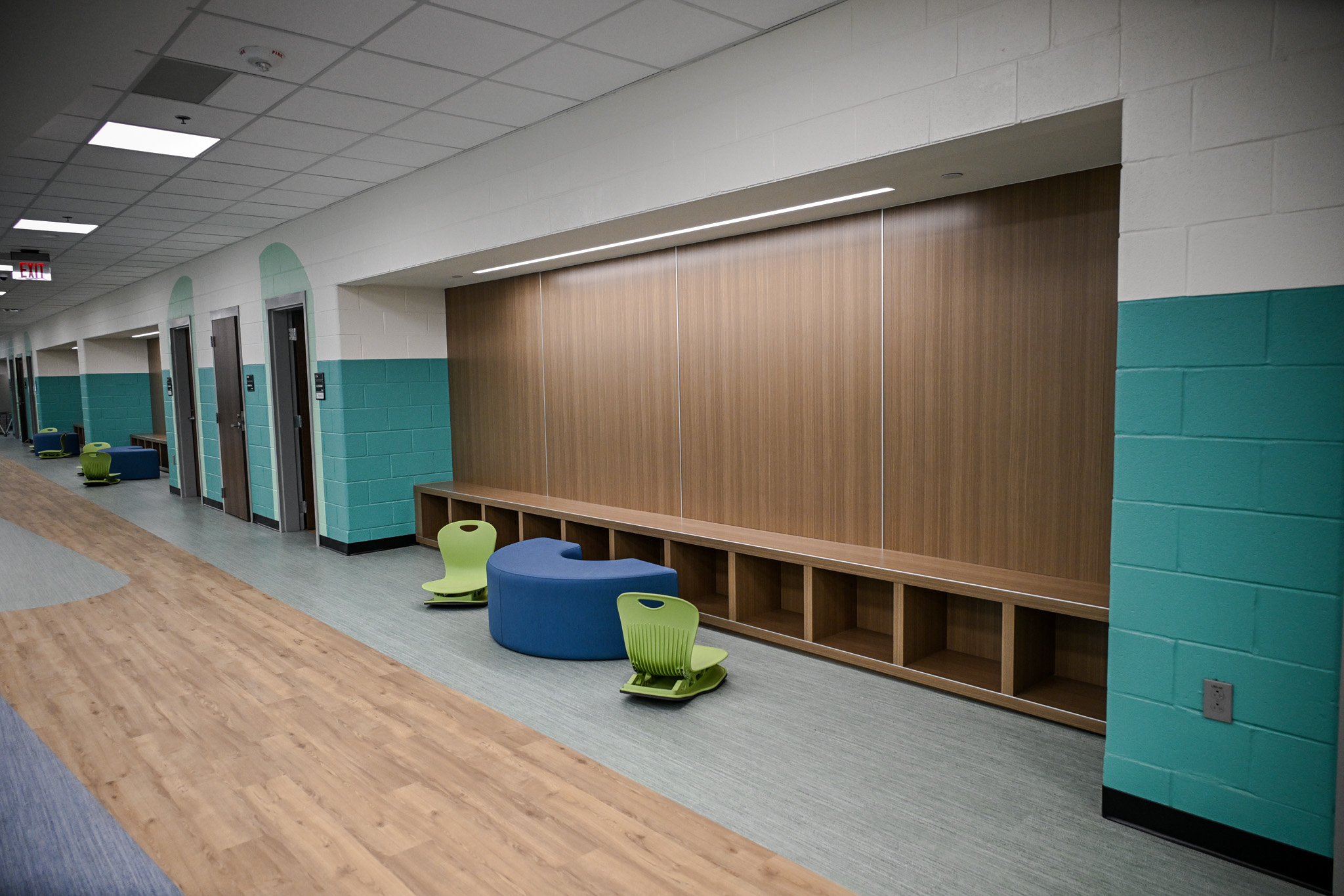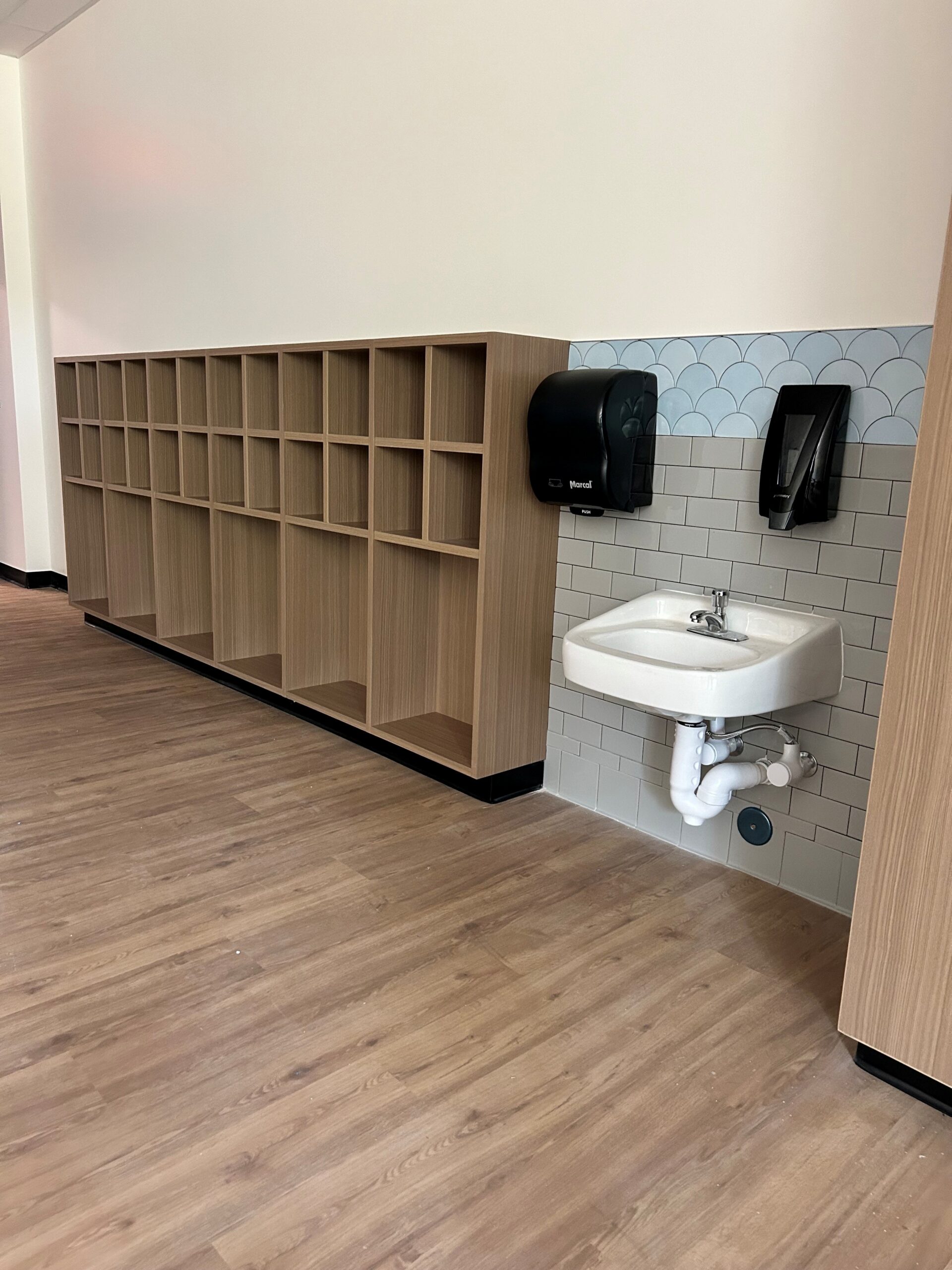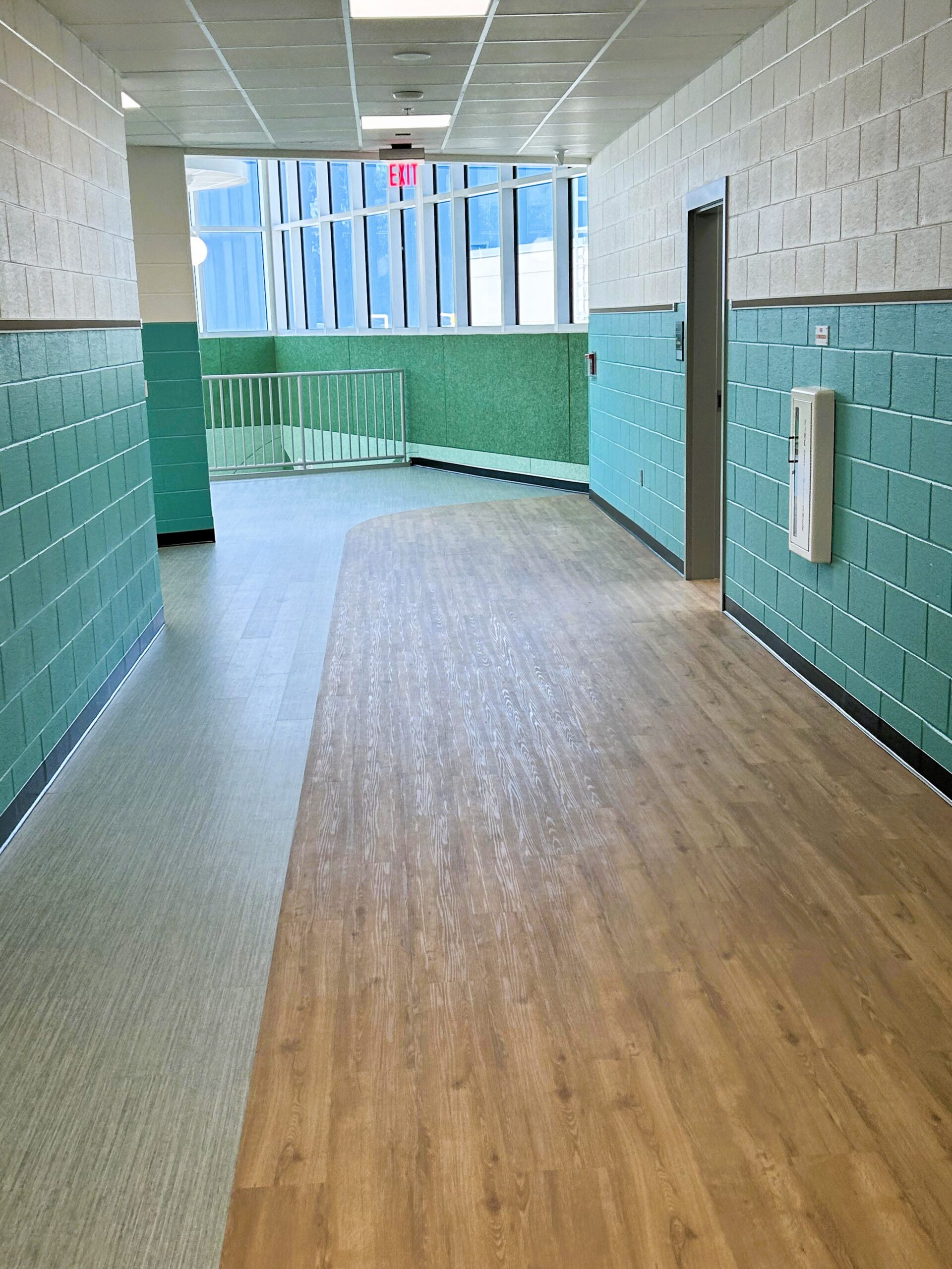 Johnsonite rubber cove base was installed throughout the facility, providing durable, hygienic, and visually integrated transitions that were coordinated to follow curved walls and radius floor conditions while maintaining clean, consistent detailing.