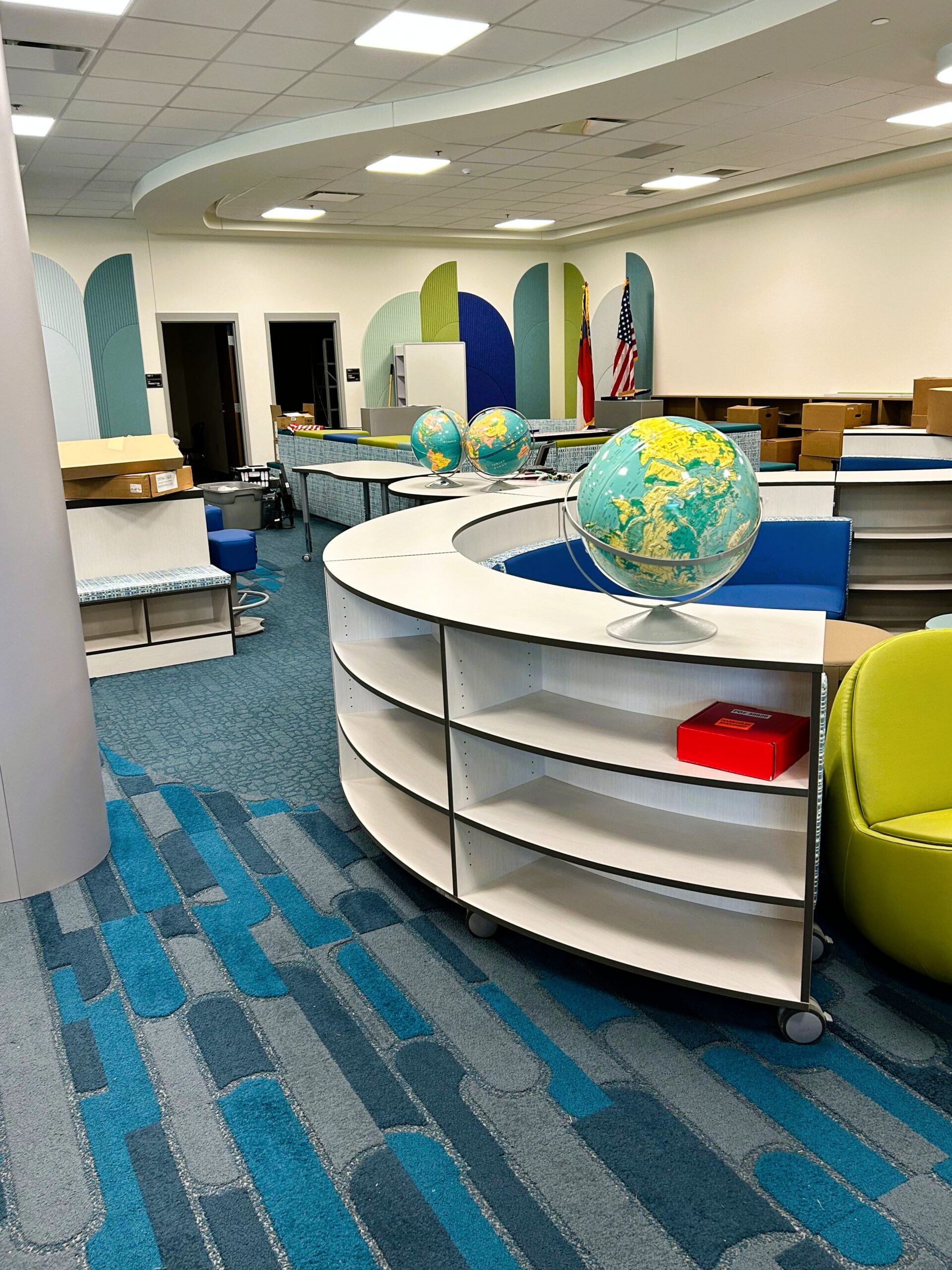 Over 1,000 square yards of Patcraft carpet tile was incorporated in the media centers and administrative spaces, with patterns coordinated to blend seamlessly with other design elements. These transitions were carefully detailed to preserve the organic design intent while providing texture to the space, supporting acoustics, durability, and clean integration around curved millwork and collaborative furnishings.