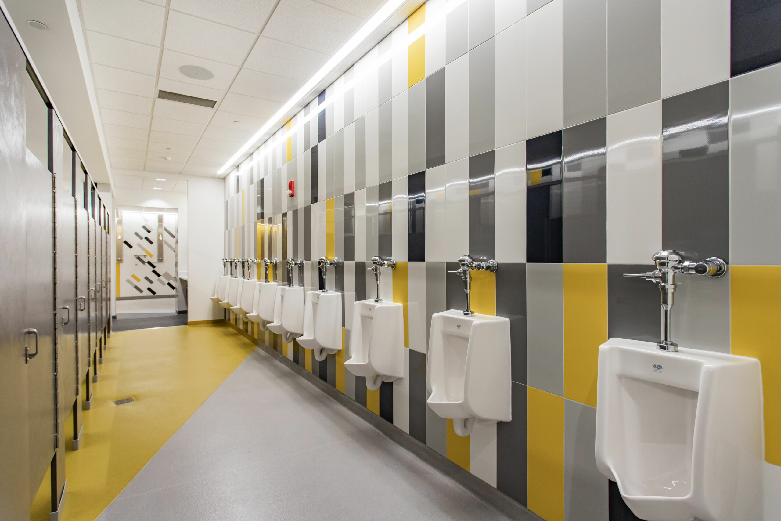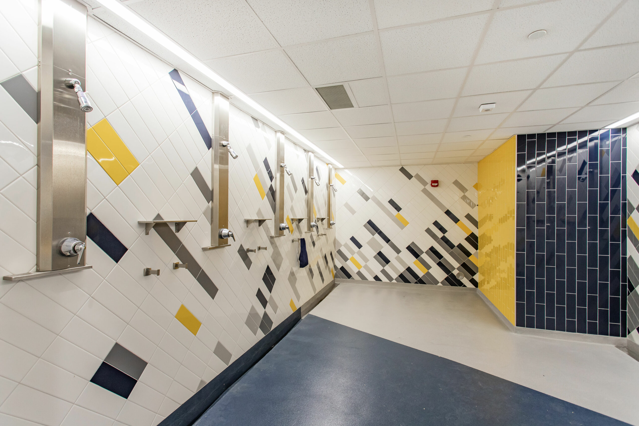 The University of Tennessee at Chattanooga (UTC) football facility underwent a significant restroom and locker room renovation featuring 4,035 square feet of American Olean ceramic tile. The project, completed as an occupied renovation, required extensive planning and coordination to minimize disruptions to the team’s operations. The installation included multiple restrooms and locker room areas spanning multiple floors of the facility, making strategic phasing essential.