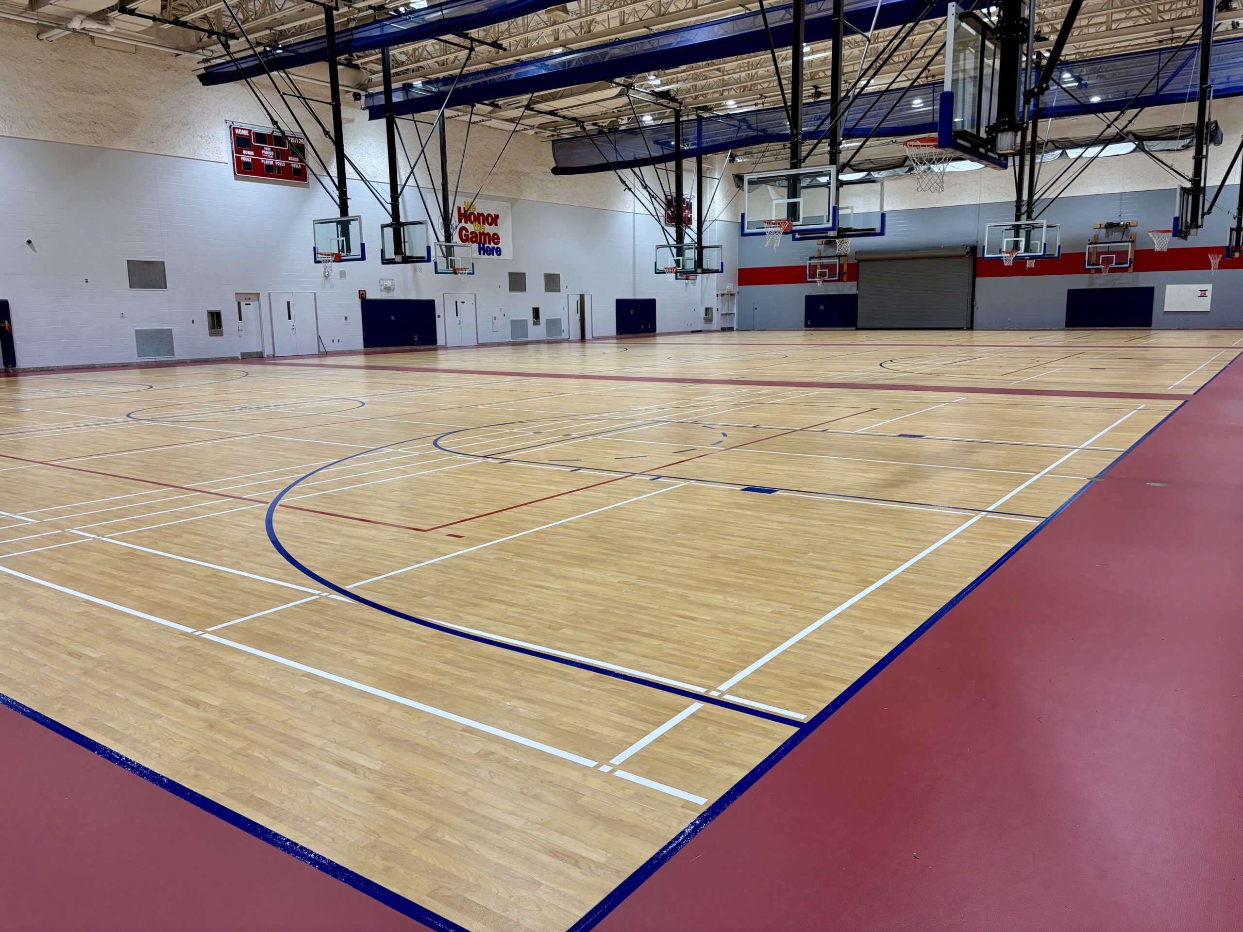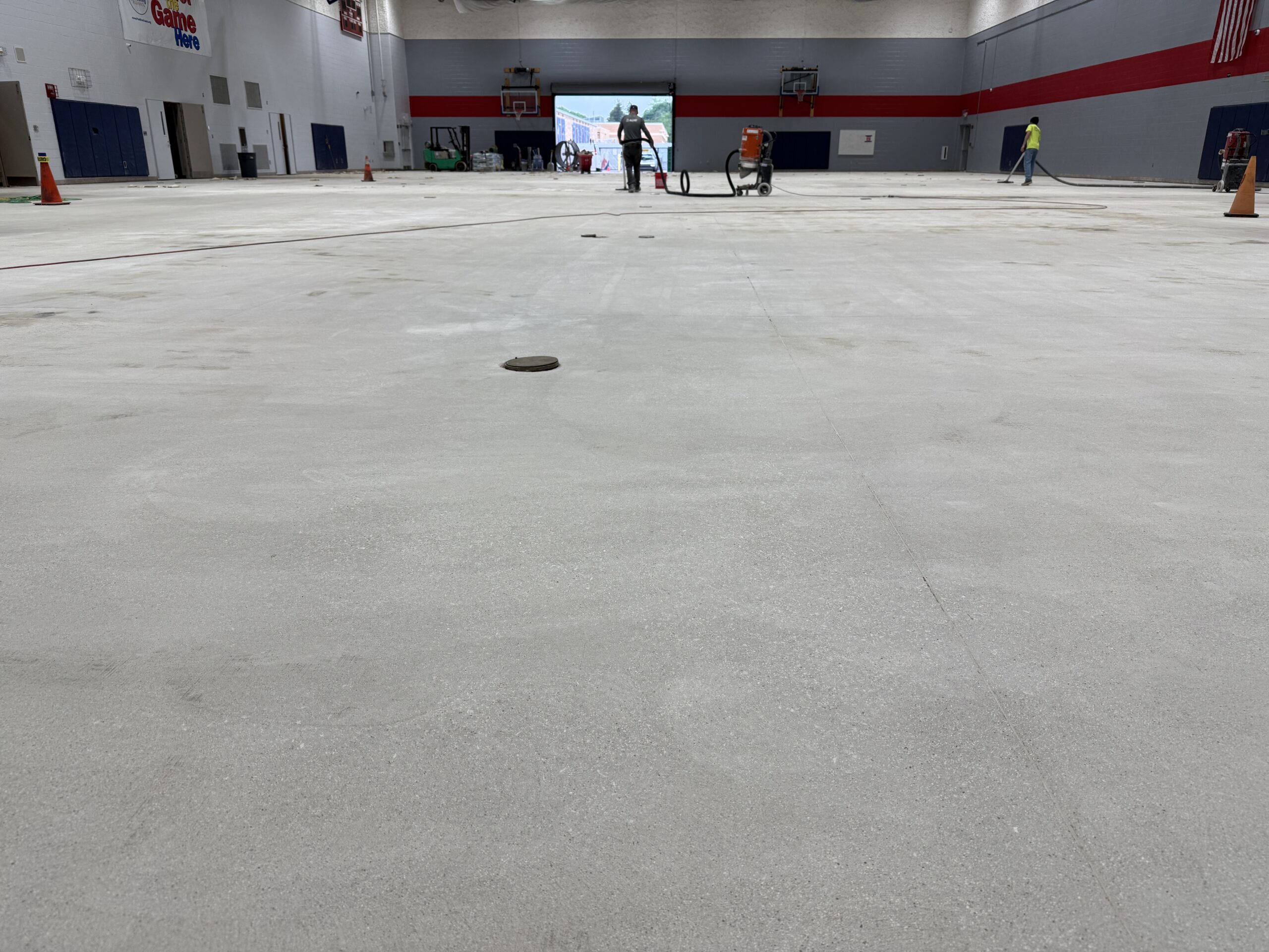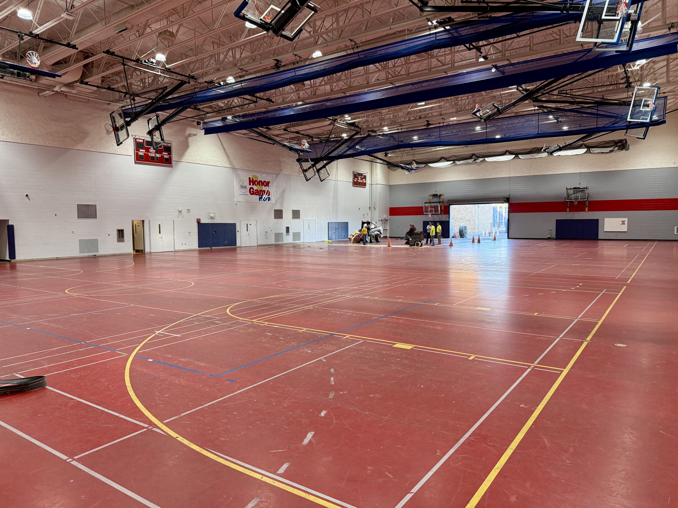 This project for the West Aurora School District was 20,000 SF. It had an existing poured urethane sport floor that had to be demoed. The material did not come up well, so we had to bring skidsteers on site to assist with the demo and disposal. The moisture content in the slab was above Tarkett’s recommended RH levels, so we had to mitigate the slab. We ground the slab to remove any bond breakers and provide a CSP of 2-3 for the mitigation system. We used Mapei Planiseal VS 2-Part Epoxy, Primer X, with a cementitious cap of Mapei Ultraplan Easy. We installed Tarkett Omnisport 8.1mm Sport Floor with heat welded seams. The layout we needed to provide was for 3 basketball courts, 3 volleyball courts, and 12 badminton courts. All of this needed to be completed before the middle of July so that the school could start fall sports training. We ran into hurdles along the entire way, demo problems, slab/moisture issues/ slow pace of sport floor installation.
