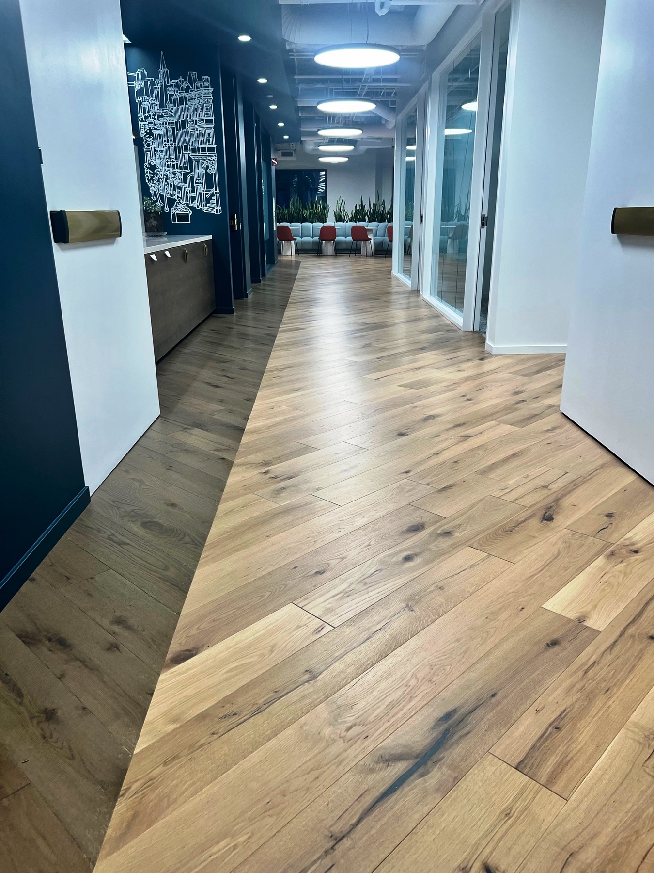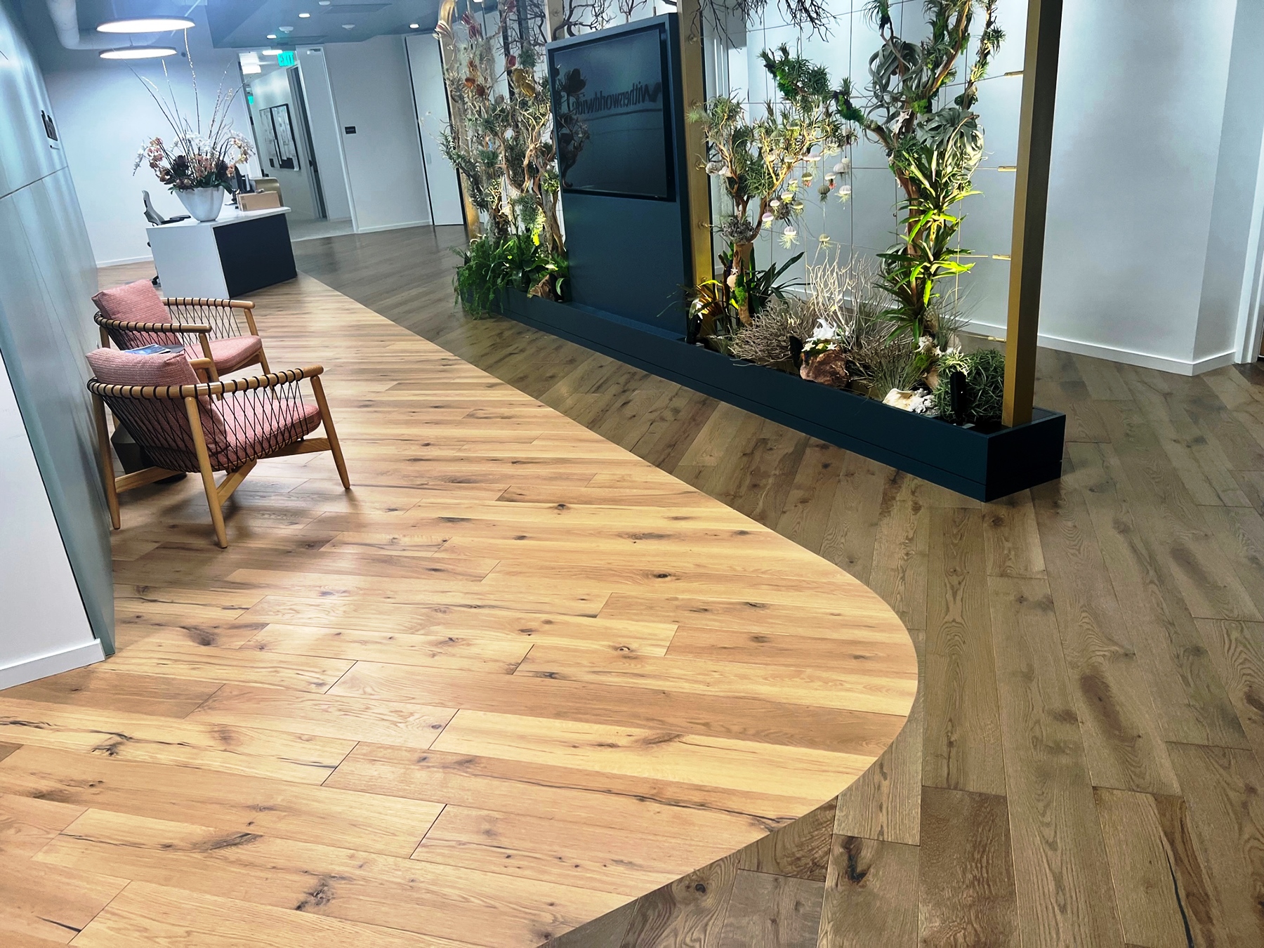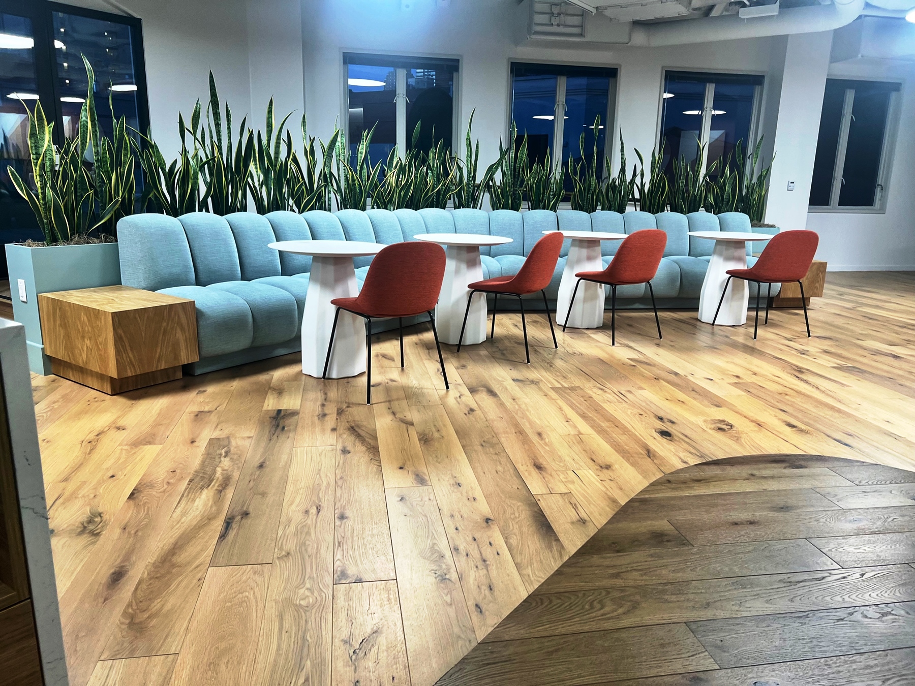 Withersworldwide was a project that achieved high-end design with a limited budget. The design team incorporated unique, yet challenging design elements to create a fresh new space for this law firm. ASD/SKY worked with Shaw Contract to select carpet styles from the Community Collection, Authenticity Engineered Wood and Compound LVT…for a truly comprehensive flooring portfolio from Shaw Contract. A dominant feature of the flooring design was two different colors of Authenticity Wood which came together on a 45 degree angle with two major curves that followed the soffit line above. The design team opted out of a Schluter metal transition between the two colors. Since we had two cut raw edges coming together without a T&G to hold it down, we had to achieve a very flat subfloor and our installers worked carefully to maintain the transition and plank line-up throughout the installation.