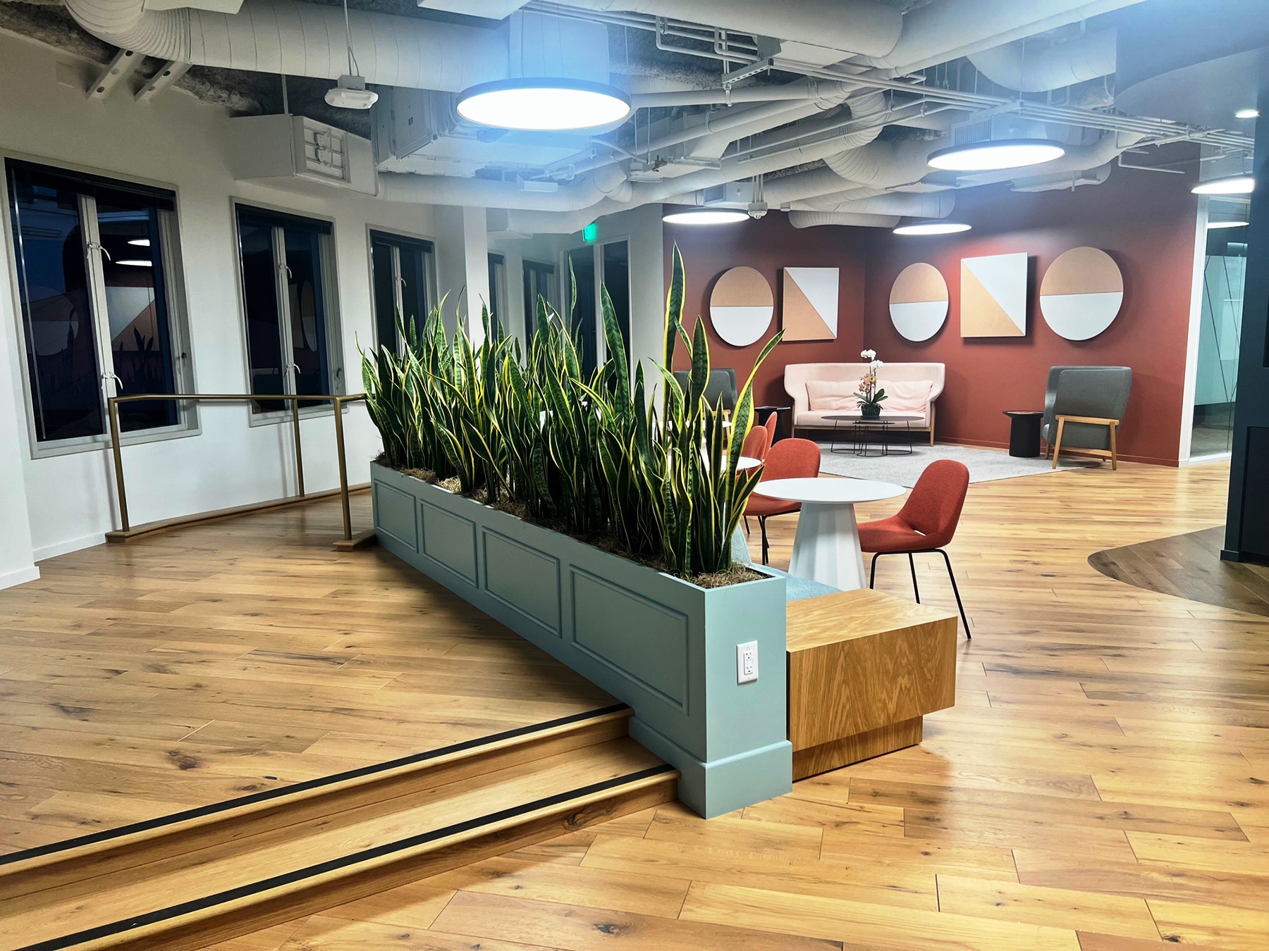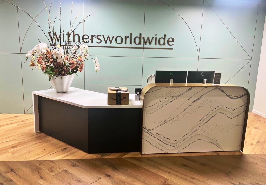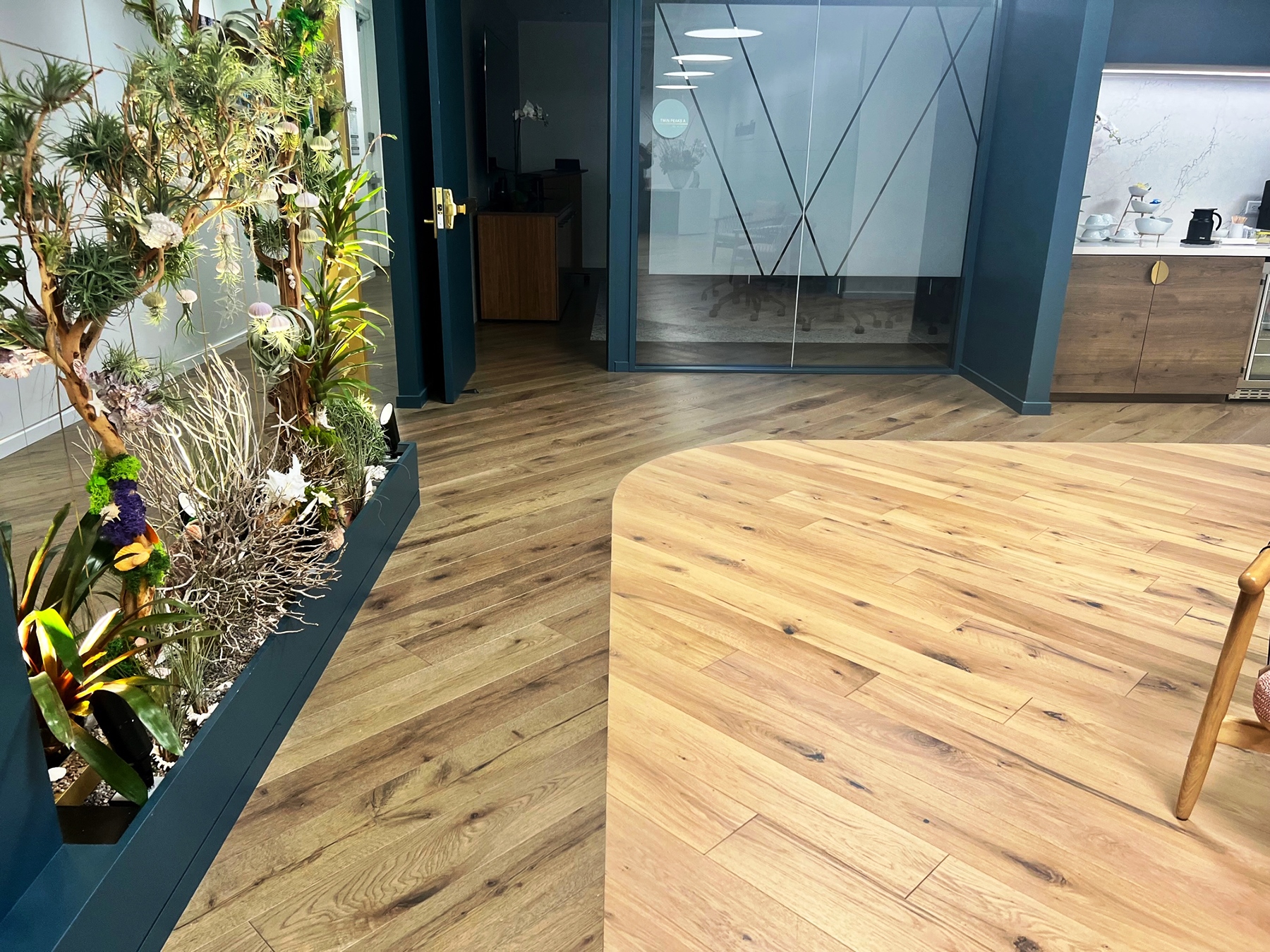 Withersworldwide was a project that achieved high-end design with a limited budget. The design team incorporated unique, yet challenging design elements to create a fresh new space for this law firm. ASD/SKY worked with Shaw Contract to select carpet styles from the Community Collection, Authenticity Engineered Wood and Compound LVT…for a truly comprehensive flooring portfolio from Shaw Contract. A dominant feature of the flooring design was two different colors of Authenticity Wood which came together on a 45 degree angle with two major curves that followed the soffit line above. The design team opted out of a Schluter metal transition between the two colors. Since we had two cut raw edges coming together without a T&G to hold it down, we had to achieve a very flat subfloor and our installers worked carefully to maintain the transition and plank line-up throughout the installation.